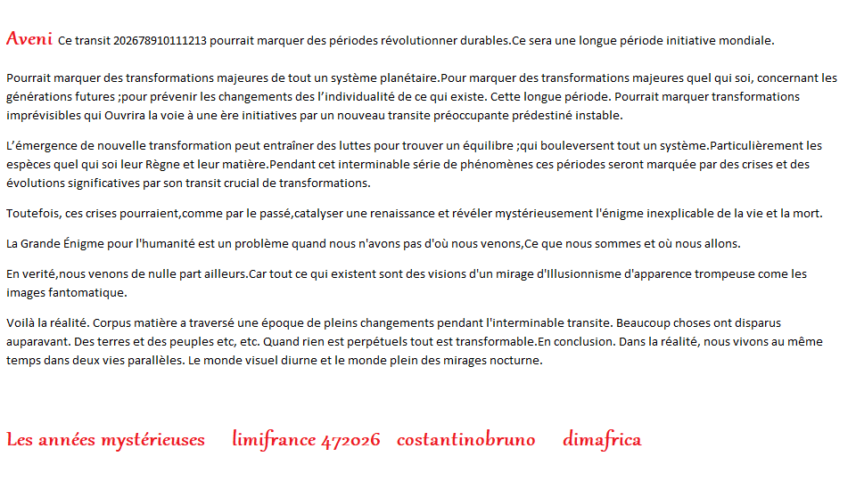 Pour vivre de sa passion et parvenir à se connaître. Mon blog. Source d'informations. Réunit les sujets thématiques (paranormaux). L'accès pour les visiteurs de mon blogue est interdit aux mineurs. Pas sérieux merci de bien vouloir s'abstenir. Limofrance costantinobruno dimafrica bruno_client@outlook.fr